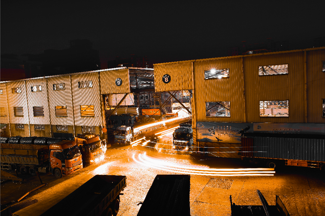 明海鑫專業鋼材交易市場,裝貨發車車水馬龍景象。